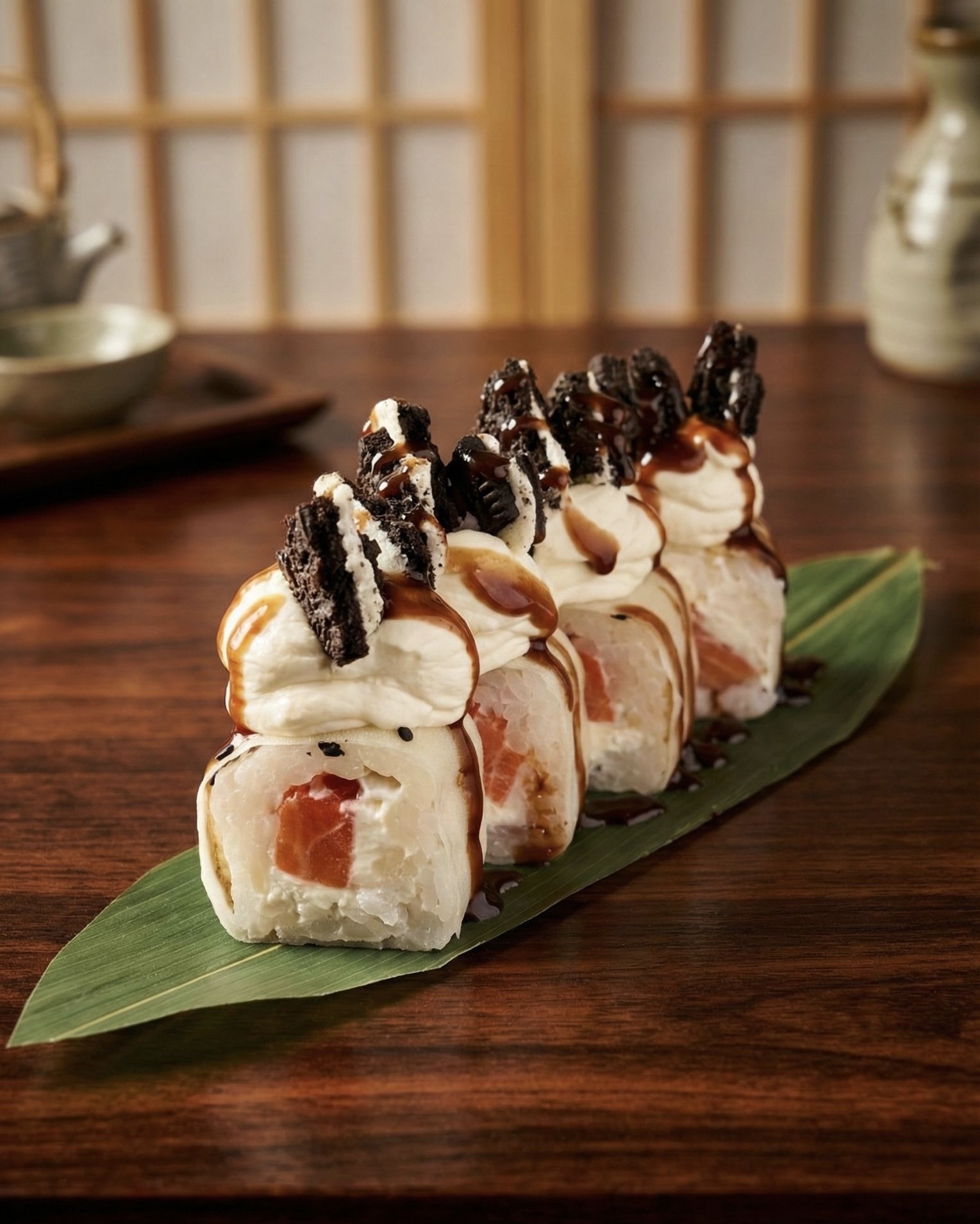 Yume No-kuro Roll (🌾, 🌱) 6,9 €(4 piezas) Un roll dulce relleno de crema de queso y Oreo triturada, con un corazón sorpresa de fresa en su interior. Terminado con nata avainillada, crumble de Oreo y un delicado hilo de sirope de chocolate. Una explosión donde lo crujiente, lo cremoso y el chocolate se encuentran en cada bocado.